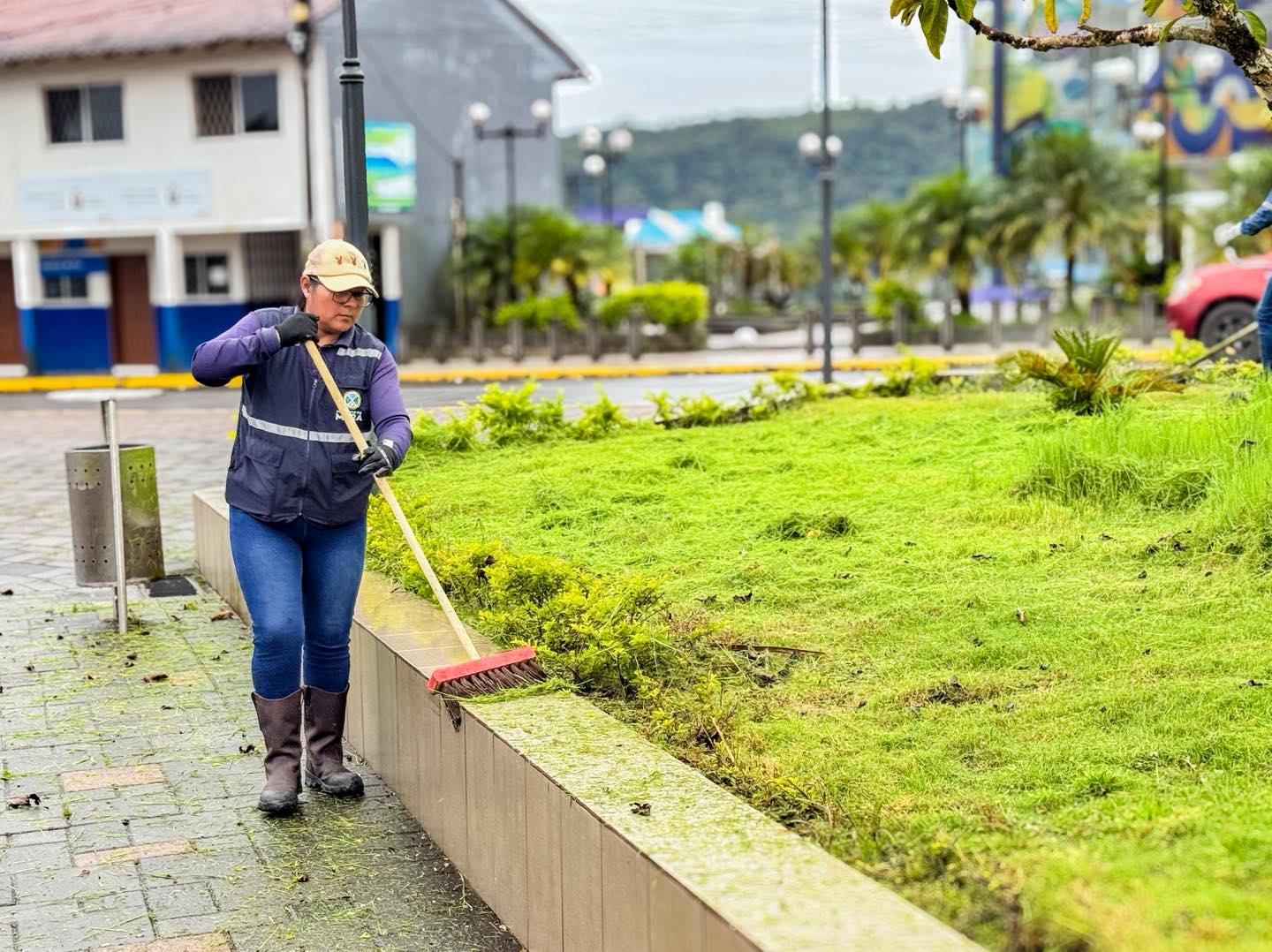 El personal de jardinerรญa del Municipio de Mera lleva a cabo labores de limpieza y desbroce de maleza en el Parque Central de la cabecera cantonal, como parte del trabajo permanente de cuidado y embellecimiento urbano.
